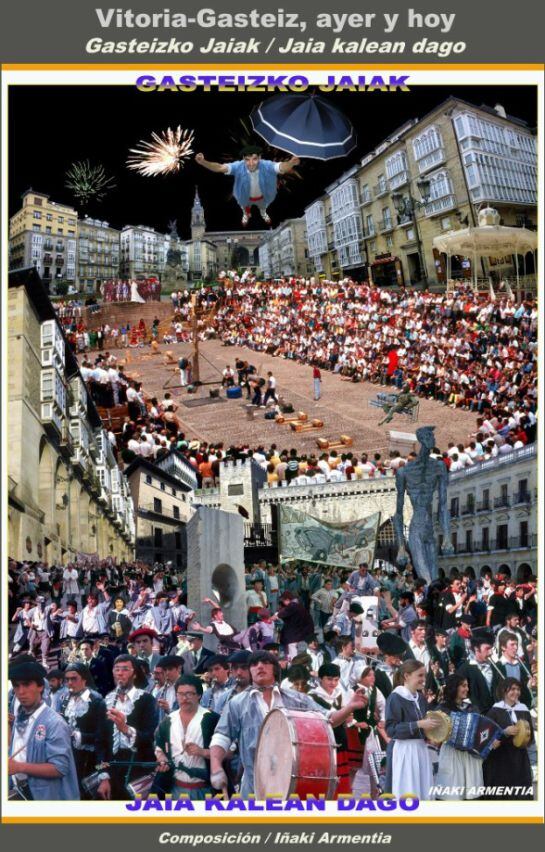 Podríamos decir como resumen que principalmente “LA FIESTA ESTA EN LA CALLE”, “JAIA KALEAN DAGO”. Así se ha querido reflejar en el póster que viene a continuación y que fue presentado al correspondiente concurso de carteles hace unos cuantos años y que no fue premiado. La mayoría de las fotos utilizadas en la composición son de principios de los ochenta, así que algunos que ya son carrozones hoy, podrán verse como pollitos en aquellas fechas.
