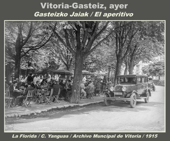 El aperitivo también es una parte del programa festivo particular de muchos. No debe faltar un marianito o un vino de rioja alavesa, acompañado de un buen pincho o unas gambas a la plancha, para despejarse de la intensidad de la noche del día anterior. Cuando el calor aprieta hay que refugiarse en un sitio con temperatura soportable y a ser posible climatizado. En 1915 no había aire acondicionado, por lo que uno de los refugios adecuados para tomar el vermú era cobijarse en una mesa bajo el arbolado del parque de La Florida, donde desde el Kiosko Cobas servían la correspondiente medicina revitalizadora.