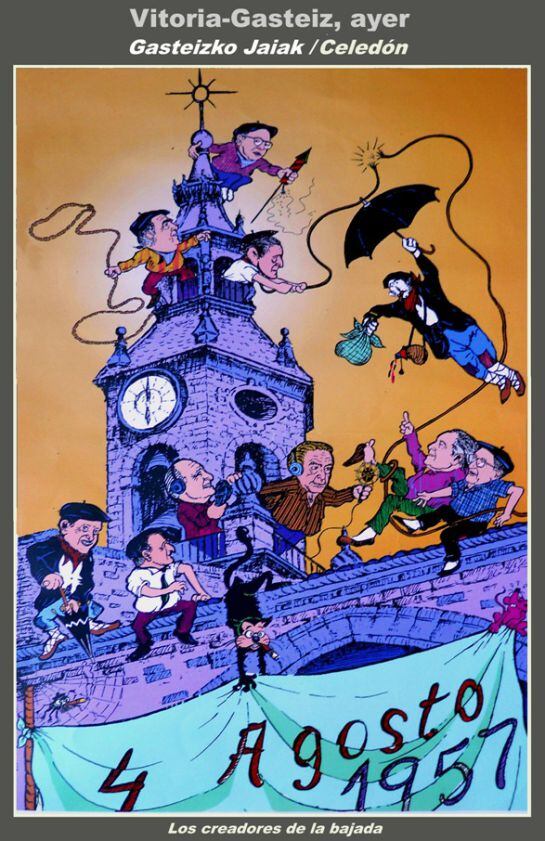La bajada de Celedón desde la Iglesia de San Miguel nos parece un acontecimiento tradicional en el inicio del programa de festejos, por los muchos años transcurridos que le han dado solera, pero en su momento fue una novedad. El 4 de Agosto de 1957 fue la primera ocasión en que se realizó. Aunque muchos lo saben, no esta de mas recordar que los creadores de este acontecimiento fueron José Mari Sedano, José Luis Isasi, Jesús Jiménez, Amado López de Ipiña, José Luis Madinabeitia, Luis Mari Sánchez, Mario López de Guereña, José Pérez de San Roman y Javier Azpiazu.