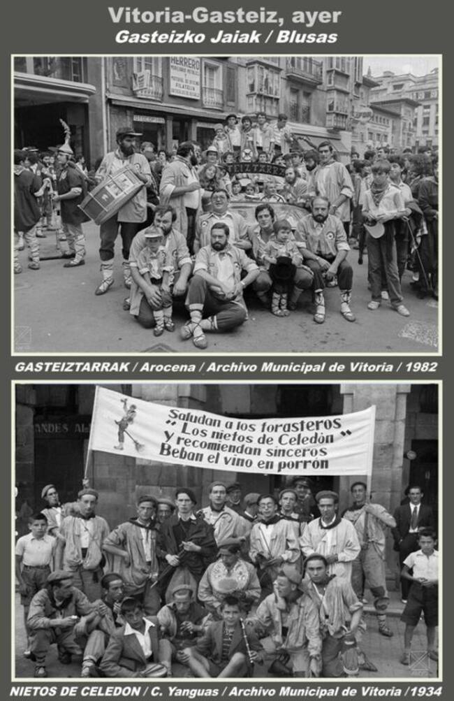 Ceferino Yanguas obtuvo varias fotos en las fiestas de 1934. En la que aquí mostramos aparece la cuadrilla de blusas Los Nietos de Celedón, con una pancarta en la que “saludan a los forasteros y recomiendan sinceros beban el vino en porrón”. Sus sucesores en la actualidad, Biznietos de Celedón, tomaron el relevo en 1968 y continuan al pie del cañón.