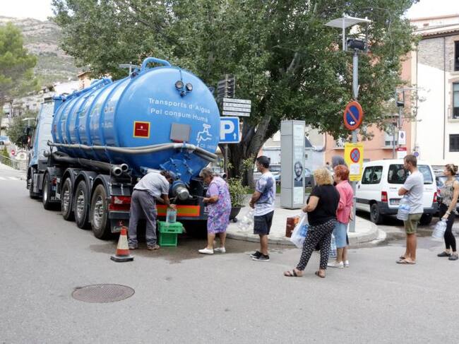El camió cisterna ubicat a la Plaça de la Font Gran de Monistrol amb diverses persones fent cua. / Martí M. (ACN)
