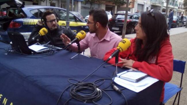El conductor del programa Hora Camp de Tarragona, Jordi Cartañá, parlant amb els organitzadors de l'acte. / Eva Hidalgo