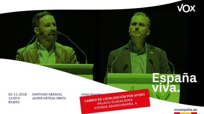 El partido de derecha VOX celebrará el próximo sábado un mitin en el Palacio Euskalduna de Bilbao para disponer de más aforo que en el hotel donde estaba previsto realizar este acto.