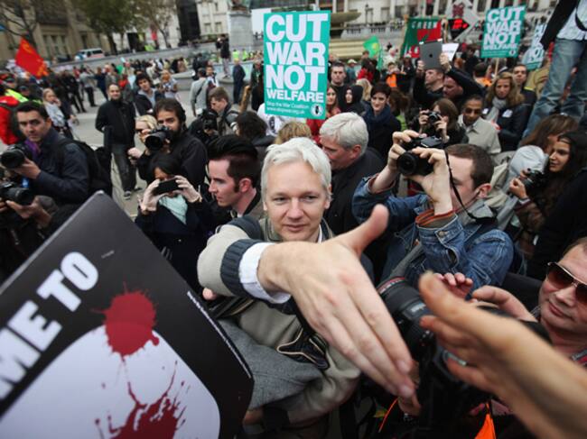 Julian Assange, saluda a sus defensores en Trafalgar Square, donde acudió a una manifestación pacifista organizada por Stop the War en octubre de 2011.(Oli Scarff/Getty Images)