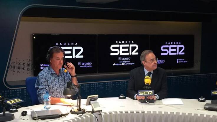 De la Morena saluda a Florentino Pérez, que ha visitado esta noche los estudios centrales de la Cadena SER para hablar en una amplia entrevista en 'El Larguero' de cómo se fraguó el fichaje de De Gea por el Madrid y el de Keylor por el United. Explicó por qué finalmente no se cerró, por la "falta experiencia del United".
