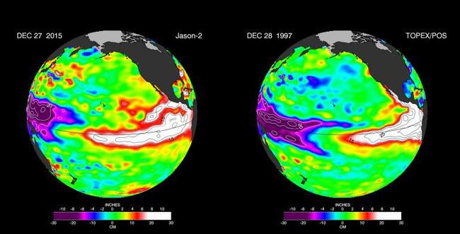 Imagen tomada por el satélite Jason-2 de la NASA que muestra la formación del fenómeno de El Niño en el año 2015 y lo compara con el máximo histórico que registró esta corriente oceánica en el año 1997 y que fue recogido por otra imagen del satélite Topex / Cadena SER