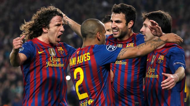 Puyol, Alves, Messi y Cesc celebran el segundo gol del argentino ante el Milan(EFE)