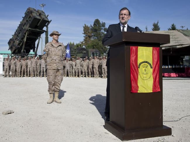 Mariano Rajoy, durante su intervención en la visita que ha realizado al contingente de 150 militares españoles en la base de Adana. / Diego Crespo (EFE)