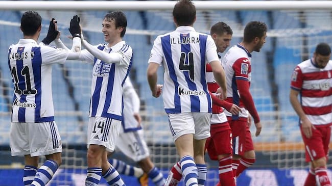 La Real Sociedad confirmó su gran momento de forma con una exhibición ante el Granada en la que brillaron Carlos Vela y el joven Mikel Oyarzabal, en un partido disputado en condiciones adversas por la lluvia y el frío en Anoeta.
