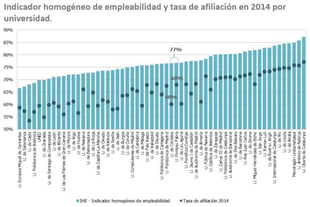 En esta edición además se ha hecho una clasificación de universidades por empleabilidad aunque los propios autores reconocen que los factores que influyen en este punto son diversos. Para realizar este ranking se han tenido en cuenta el estudio elaborado por el ministerio de Educación en 2014, con datos sobre la afiliación a la Seguridad Social de los egresados. Las cifras se han ponderado con las tasa de empleo de cada comunidad autónoma. El estudio sitúa a la Universidad Oberta de Cataluña y a la Antonio de Nebrija como las universidades con mayor empleabilidad.