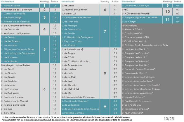 La universidad Pompeu Fabra en Barcelona encabeza, por tercer año consecutivo, el U Ranking que elaboran la Fundación BBVA y el Instituto Valenciano de Investigaciones Económicas (IVIE). Tras ella se sitúan en este orden: la Politécnica de Cataluña, la Carlos III de Madrid, la Rovira y Virgili de Tarragona y la Politécnica de Valencia. Todas son universidades públicas. Este ranking analiza distintos indicadores agrupados en tres áreas: docencia, investigación e innovación y desarrollo tecnológico.