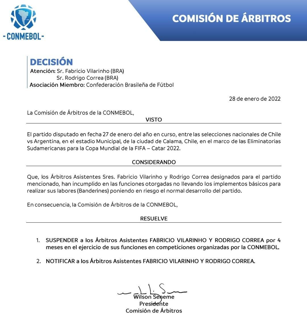 Suspende a los dos asistentes brasileños por utilizar chalecos reflectantes en lugar de la bandera correspondiente en el Chile vs Argentina de anoche.