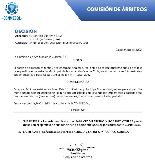 El organismo que regenta el fútbol americano, la CONMEBOL, ha anunciado la suspensión de los asistentes del partido entre Chile y Argentina por usar chalecos reflectantes en lugar de los habituales banderines.
