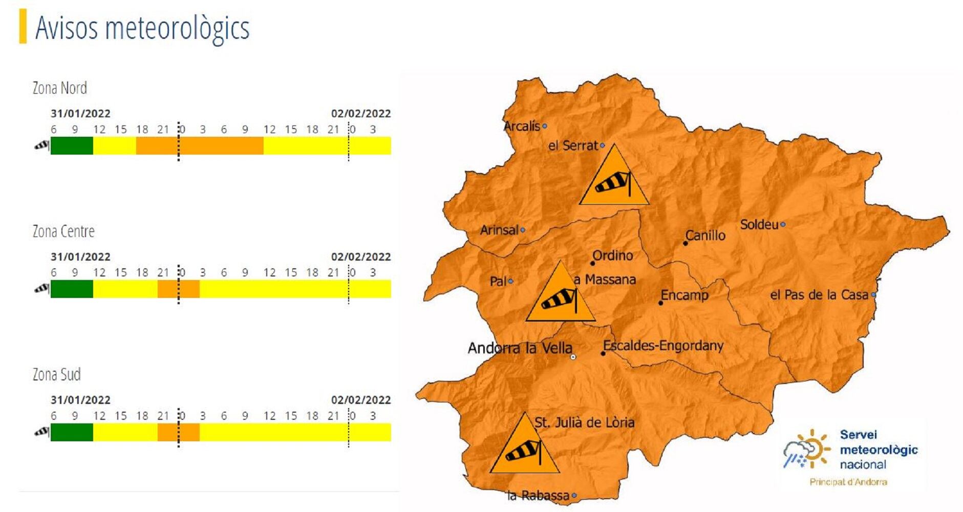 El Servei Meteorològic d'Andorra ha activat l'alerta per fort vent aquest dilluns. Segons indica, es poden superar els 100 quilòmetres per hora als fons de vall més estrets aquesta propera nit i els 140 quilòmetres per hora als cims.