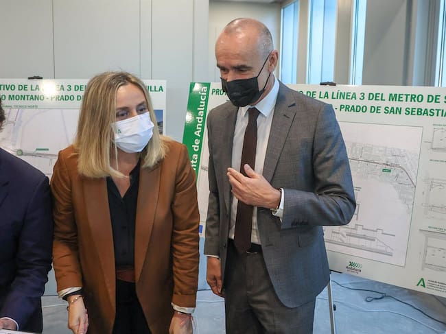 12-01-2022 La consejera de Fomento, Infraestructuras y Ordenación del Territorio, Marifrán Carazo, junto con el alcalde de Sevilla, Antonio Munoz, a la llegada al acto de la presentación del tramo norte de la línea 3 del Metro de Sevilla, a asociaciones, colectivos, plataformas, agentes sociales y colegios profesionales a 12 de enero del 2022 en Sevilla (Andalucía) POLITICA Joaquin Corchero - Europa Press / Joaquin Corchero - Europa Press