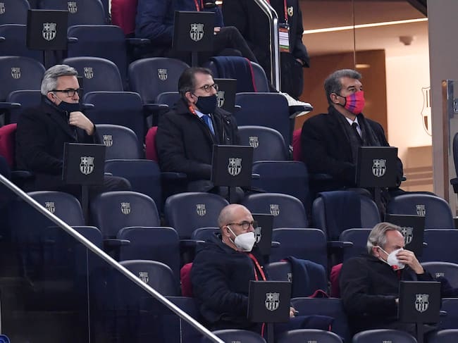 BARCELONA, SPAIN - MARCH 03: Candidates for the Barcelona presidency (L_R) Victor Font, Toni Freixa and Joan Laporta look on from the stands during the Copa del Rey Semi Final Second Leg match between FC Barcelona and Sevilla at Camp Nou on March 03, 2021 in Barcelona, Spain. Sporting stadiums around Spain remain under strict restrictions due to the Coronavirus Pandemic as Government social distancing laws prohibit fans inside venues resulting in games being played behind closed doors. (Photo by David Ramos/Getty Images) / David Ramos