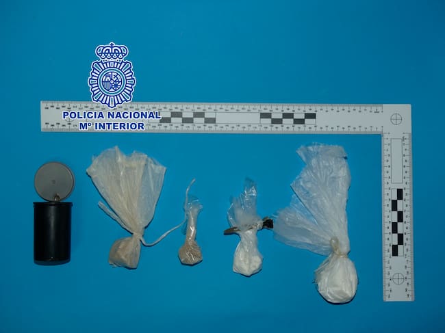 Una vez identificado, los agentes llevaron a cabo un cacheo superficial y localizaron ocultos en una bolsa plástica de las que habitualmente se utilizan para recoger los excrementos de los perros así como en un bote de los que se utilizaban para guardar los carretes de las antiguas cámaras de fotos, varios envoltorios plásticos conteniendo diferentes cantidades de cocaína y heroína, de las que una vez debidamente “cortados” para su distribución al consumidor final, podrían resultar unas 70 dosis de cocaína y unas 50 de heroína. Por todo ello los agentes policiales lo detuvieron como presunto autor de un delito de tráfico de drogas y lo trasladaron a dependencias policiales.