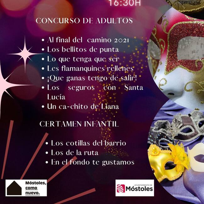 Además, el 26 de febrero a las 18 horas comenzará el tradicional desfile de comparsas con la participación de 37 peñas, asociaciones y colectivos de Móstoles, iniciándose en la calle Desarrollo. A su término, se leerá el pregón en la Plaza de España, a lo que seguirá el baile de Carnaval en la Plaza del Pradillo.