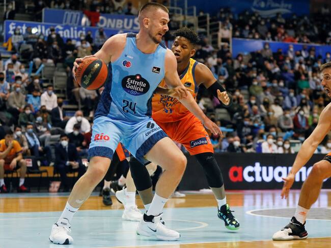 LUGO, 13/02/2022.-El jugador del Río Breogán R. Mahalbasic, y el jugador del Valencia Basket Van Rossom, durante el partido de Liga ACB de la jornada 22, hoy domingo en el Pazo dos Deportes de Lugo.- EFE/Eliseo Trigo / Eliseo Trigo (EFE)