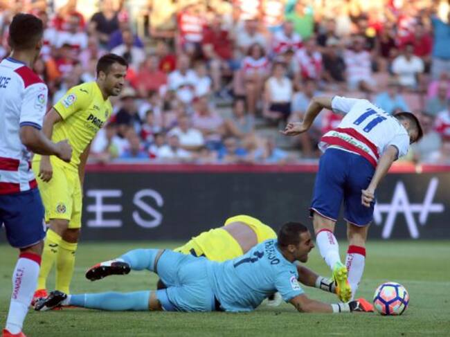 El portero del Villarreal Asenjo intenta parar un balón ante el defensa Mario Gaspar y los jugadores del Granada durante el partido correspondiente a la primera jornada de Liga que ambos equipos disputan en el estadio de Los Cármenes, en Granada. / PEPE TORRES (EFE)
