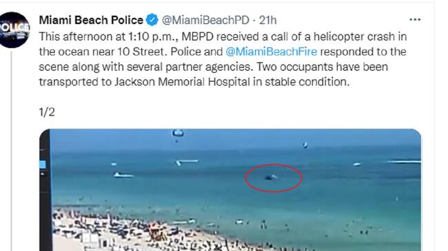 En su Twitter, la Policía de Miami Beach indicó que los dos ocupantes del helicóptero fueron trasladados a un hospital cercano y se encuentran en "condición estable".