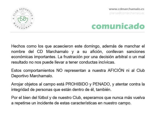 Finalmente tras la intervención del delegado del Marchamalo y cuando la Guardia Civil garantizó la integridad del equipo arbitral, el partido se reanudó disputándose los últimos minutos.