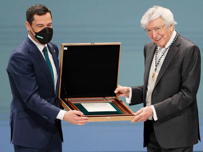 SEVILLA, 28/02/2022.- El presidente de la Junta de Andalucía, Juanma Moreno (i), entrega la distinción de Hijo Predilecto de Andalucía al compositor Manuel Alejandro (d) durante la ceremonia de entrega de medallas del Día de Andalucía celebrado este lunes en el teatro de la maestranza de Sevilla. EFE/José Manuel Vidal / José Manuel Vidal (EFE)