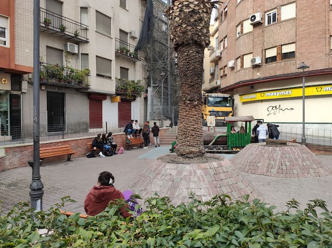 Personas sentadas alrededor de una plaza en el centro de Jaén capital / Jose Gómez Garrido