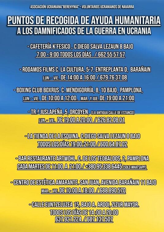 En la Comunidad Foral de Navarra hay 2.000 personas de origen ucraniano. Una comunidad que vive con el alma en vilo desde la madrugada del jueves y que pide que desde Navarra se dé toda la ayuda posible. "Con recogida de alimentos, con medicamentos, ropa, pero sobre todo necesitamos ayuda con el transporte, para llevar lo recogido a la frontera con Polonia", ha explicado Tania Polischuk, una ucraniana que vive en Navarra.