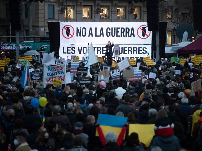 Más de un centenar de entidades, plataformas, partidos y sindicatos participan este miércoles en la concentración de rechazo a la guerra de Ucrania convocada en Barcelona / Marta Pérez (EFE)