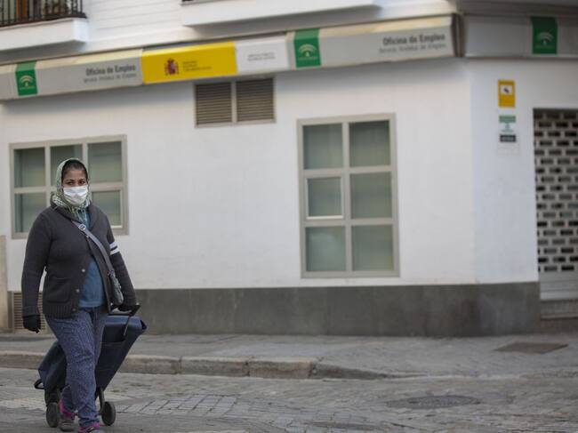 Una mujer con mascarilla portando un carro de la compra camina delante de una Oficina de Empleo. / María José López - Europa Press (EUROPA PRESS)