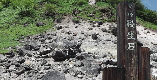 Según recoge la mitología japonesa, la legendaria roca volcánica alberga el cadáver transformado de Tamamo-no-Mae. Una mujer, al servicio de un malvado señor feudal, que hizo todo lo posible para acabar con el emperador Konoe y establecer un nuevo régimen en el país. Sin embargo, y después de que el emperador descubriera los planes de Tamamo-no-Mae y el señor feudal gracias al chivatazo de un astrólogo, quien le advirtió que la mujer era en realidad un zorro de nueve colas que trataba de acabar con su vida, Konoe convocó a los guerreros Kazusa-no-suke y Miura-no-suke para que le dieran caza y acabaran con su vida.