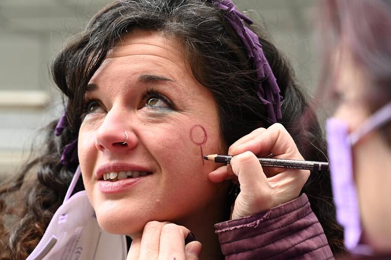 Una mujer pintándose el símbolo de la igualdad en la cara para la manifestación de Madrid por el 8M.