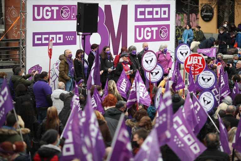 Centenares de militantes de UGT y CCOO se concentran este martes en la Plaza del Museo Reina Sofía de Madrid con motivo del 8M