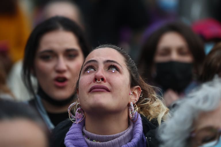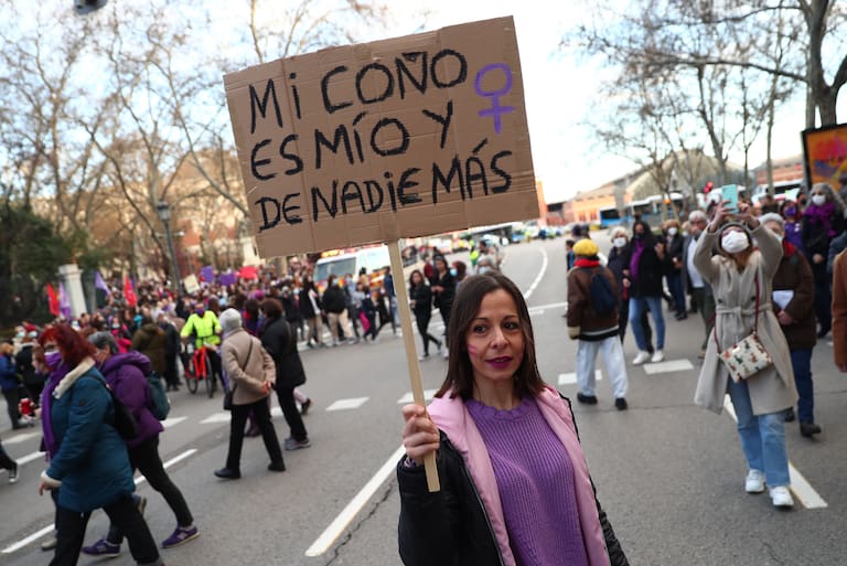 MADRID, 08/03/2022.- Una mujer participa este martes en una marcha con motivo del Día Internacional del Día de la Mujer en Madrid. Miles de mujeres saldrán de nuevo a las calles este 8 de marzo para reivindicar la necesidad de seguir avanzando hacia la igualdad. EFE/ Miguel Oses
