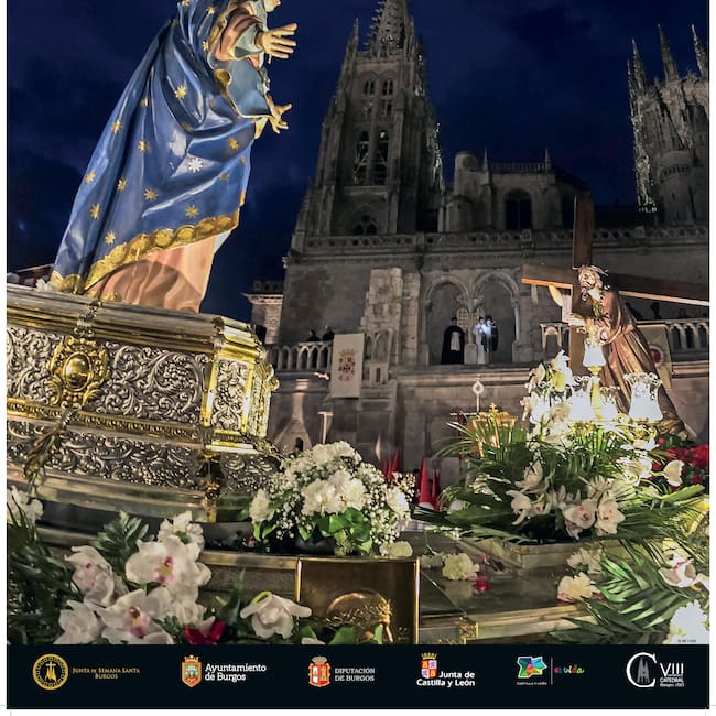 El cartel de la Semana Santa de Burgos 2022 es una imagen de la procesión de El Encuentro, que cumple 75 años, con los pasos de la Virgen de los Dolores y Jesús con la Cruz a cuestas, con la Catedral de fondo y que iba a ser el cartel de la Semana Santa 2020 que la pandemia anuló.
