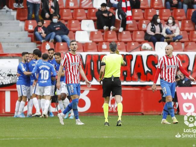 Los jugadores del Sporting dialogan con el árbitro tras encajar uno de los goles del Tenerife. / LaLiga