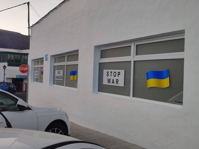 Frases como "no invasión" y "stop war" lucen desde hace varios días en un local de grandes dimensiones que se encuentra en la entrada de la localidad de Órzola, en el municipio de Haría, acompañadas además de varias banderas de Ucrania.