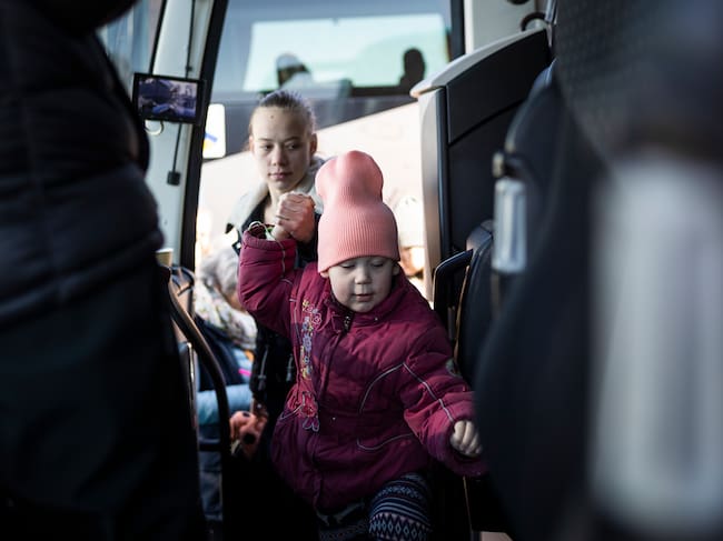 Un grupo de menores espera para subir en los autobuses fletados por la ONG Unidos por la Libertad con destino a Valencia que sale de la localidad de Przemysl Polonia, situado junto a la frontera con Ucrania. / Rodrigo Jimenez (EFE)