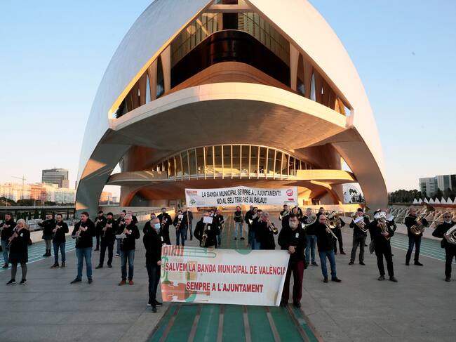 Imagen de archivo de los integrantes de la Banda Municipal de València cuando se concentraron a las puertas del Palau de les Arts en protesta contra la decisión del gobierno municipal de trasladar la agrupación al Palau de la Música / Biel Aliño (EFE)