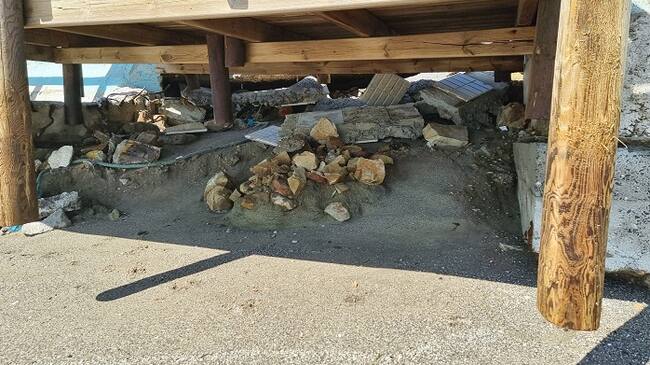 Los mayores daños del paseo se concentran en una longitud de 300 metros con zonas totalmente destruidas. En la Atunara, también se han producido socavones en la zona trasera de la parroquia del Carmen y en la pasarela de acceso a la playa del Tonelero, prácticamente en el aire y sin soporte basal.