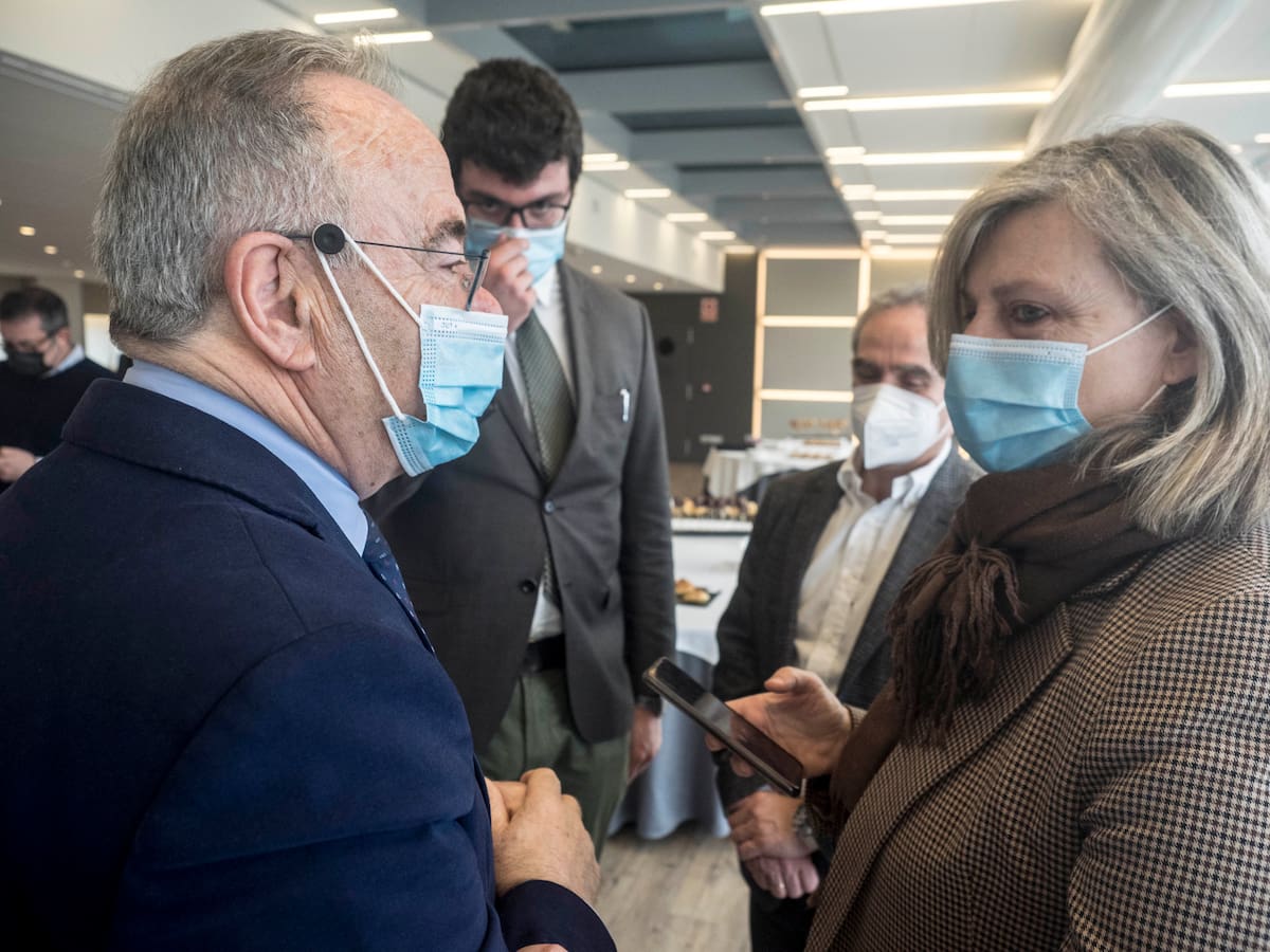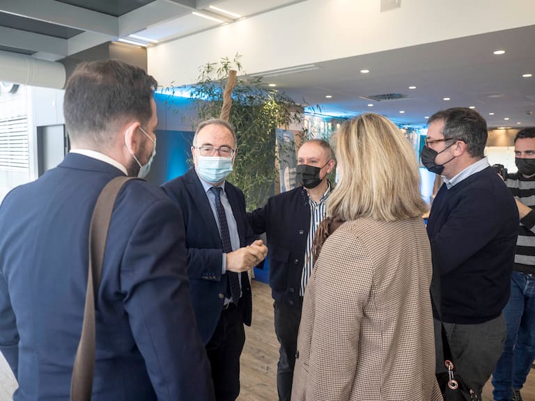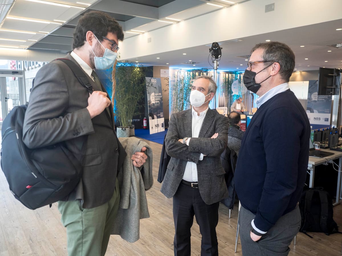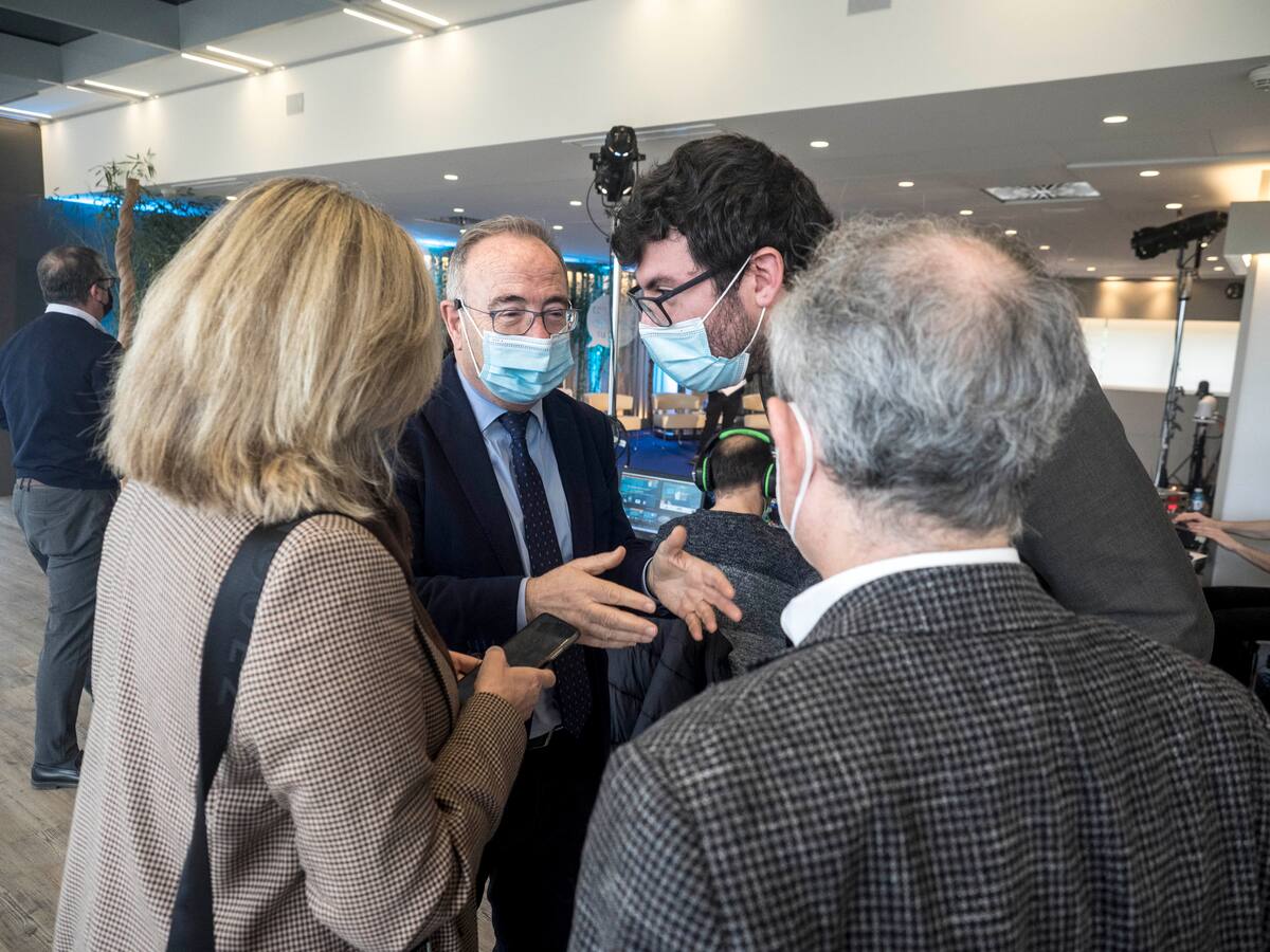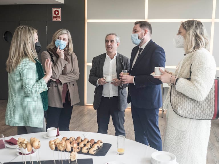 Sánchez Bugallo, alcalde de Santiago y Rubén Prol, concelleiro de educación, charlando con Mario Moreno, Dir. SER Galicia y Aida Pena Dir. Contenidos SER Galicia