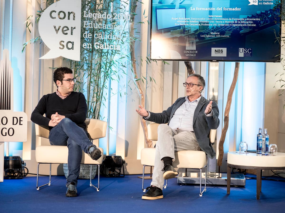 Ángel Rodríguez, Responsable Centro Autonómico de Formación e Innovación, exponiendo sus opiniones y Alexandre Sotelino, Profesor USC Teoría e Historia de la Educación