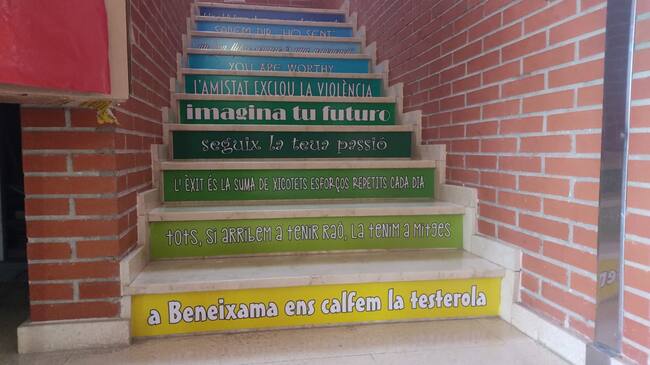 Los escolares, y en cualquier caso todo el personal docente, familias incluidas, tienen motivos para la lectura, a través de los peldaños de las escaleras del colegio público de Beneixama