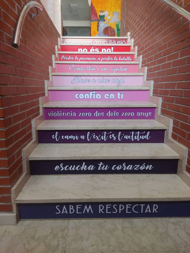 Mediante esta iniciativa, una parte de las peldaños de las escaleras se han decorado con los títulos de algunos de los libros más conocidos de la literatura y también de los mismos escolares, como Don Quijote, Las Aventuras de Tom Sawyer, Rondalles de Beneixama, Viaje al Centro de la Tierra y otros... y algunas otras escaleras exhiben frases en valenciano con motivos para la reflexión en el ámbito educativo como TOTS, SI ARRIBEM A TENER RAO, LA TENIM A MITGES.... L´AMISTAD EXCLOU LA VIOLENCIA... y otras