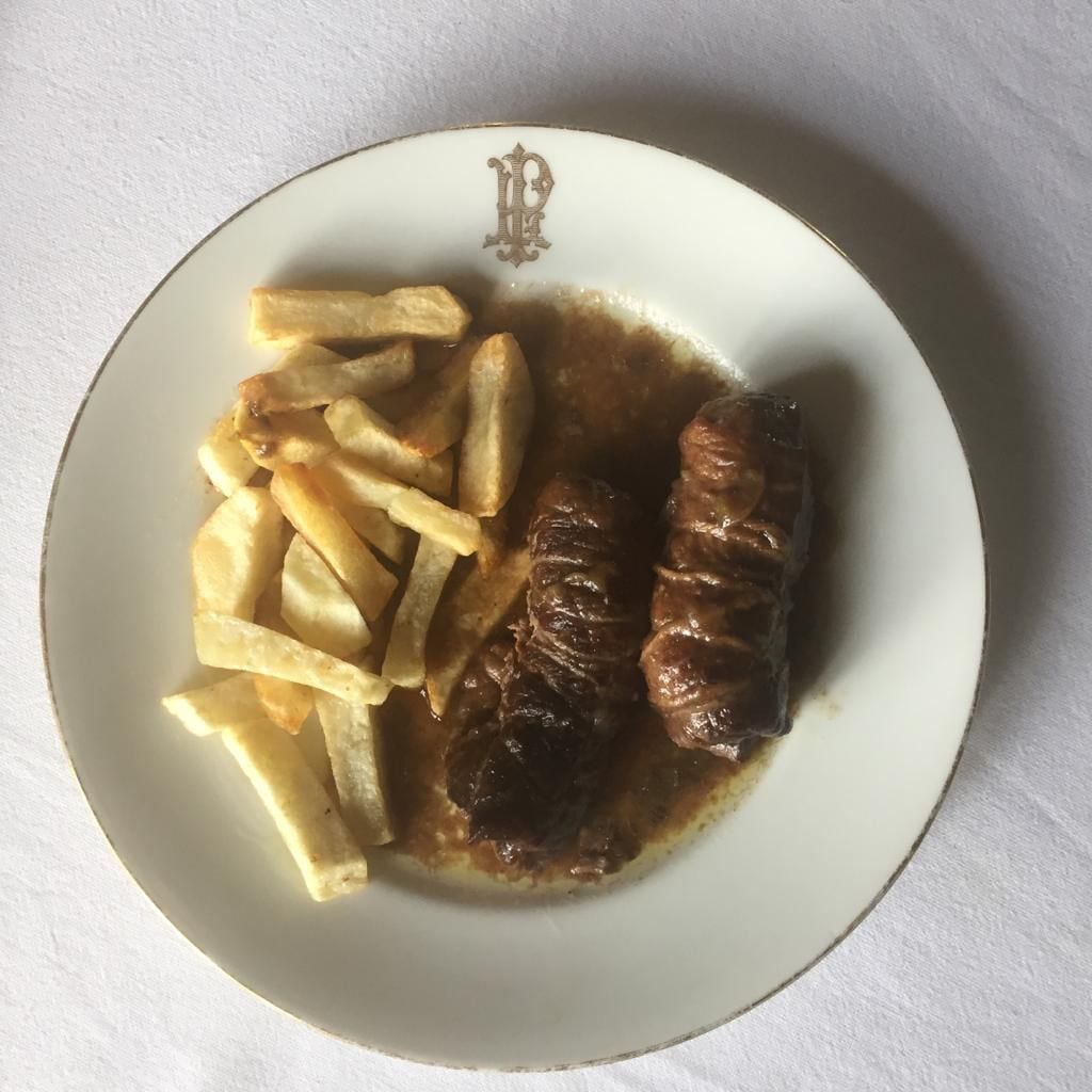 Rallar la cebolla y picar muy finito el perejil, poner en un bol, mezclar con la carne picada y hacer una masa. Poner los filetes sobre una tabla espalmarlos si son algo gorditos y salpimentarlos por ambos lados, untarlos por una cara con un poco de mostaza, poner una loncha de panceta sobre ella una cucharada de la mezcla de carne y enrollar formando un cilindro, atar con hilo de cocina formando un paquetito como si fuera un niño envuelto y enrrolladito en su chal también se puede sujetar con palillos pero no queda igual de mono.