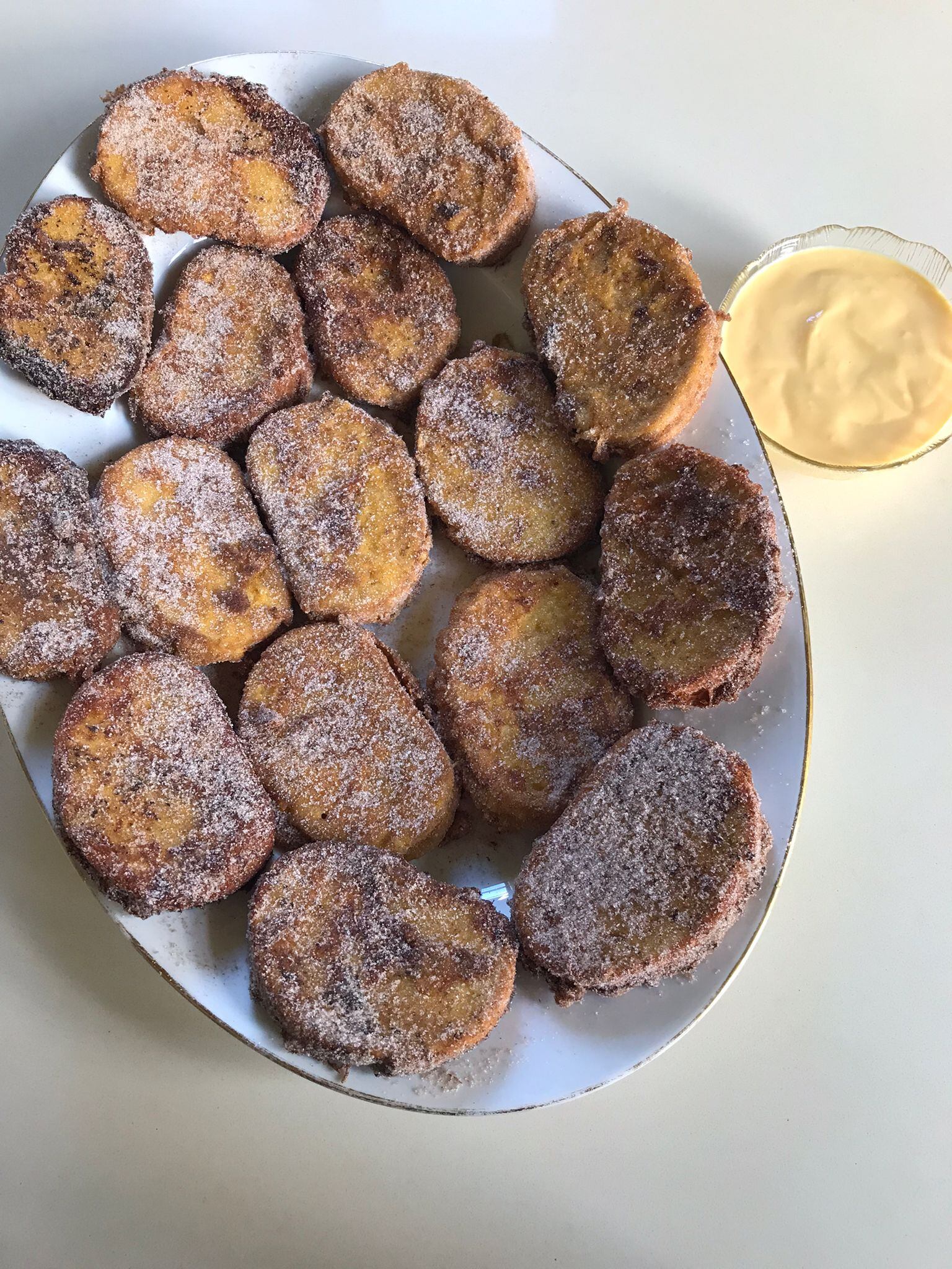 Se corta el pan en rebanadas gruesas y se pone en una fuente un poco honda . Se hacen las natillas según la receta que tenga cada uno, las nuestras las puse hace poco y no las vuelvo a poner por no alargarme con tanto rollo, se dejan reposar 5 minutos y con un cucharón se van poniendo sobre el pan para que empapen bien las rebanadas, una vez echo esto se cogen de una en una, se rebozan en el huevo batido y se fríen, se pasan a papel absorbente y cuando hayan atemperado se rebozan en azúcar y canela y a comer . Mi madre siempre hacía un poco más de natillas y las acompañaba con ellas en salsera por si alguien se quedaba con hambre.