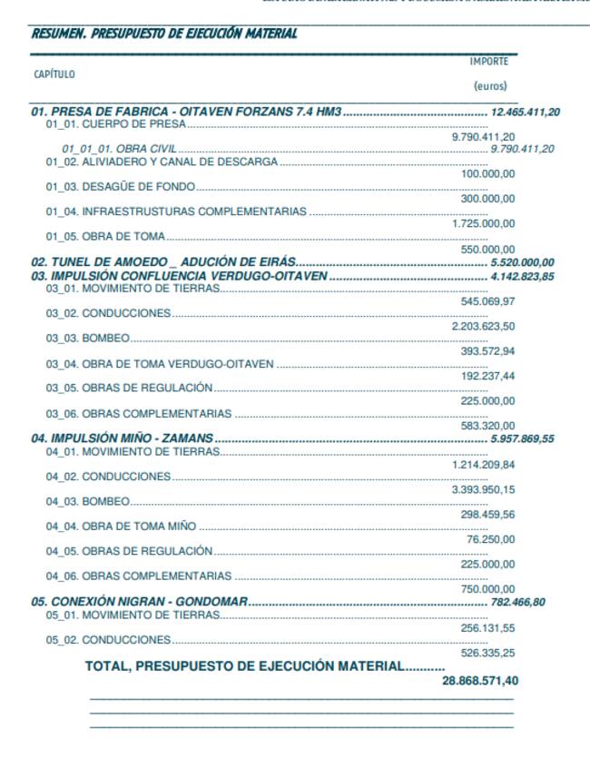 En total serán más de 28 millones de euros, 12,5 de la presa, los 512 del túnel de Amoedo a los que hay que sumar 4,14 millones de la impulsión de la confluencia del verdugo oitavén para dar agua a Eiras, casi tres millones de la impulsión del Miño para dar más agua a Zamáns y 782.000 euros para la nueva conexión para Nigrán y Gondomar.