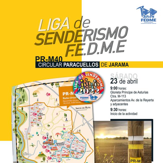 El Ayuntamiento de Paracuellos de Jarama colabora con el Grupo Amadablan de Montañismo en la organización de una jornada de la Liga de Senderismo de la Federación Española de Deportes de Montaña y Escalada (FEDME), que se celebrará en el municipio el sábado 23 de abril. El Ayuntamiento, que es promotor de la Red de Senderos de Paracuellos de Jarama, colaborará con la instalación de los avituallamientos y el reparto de las bolsas para la recogida de residuos que podrán encontrarse durante el recorrido.