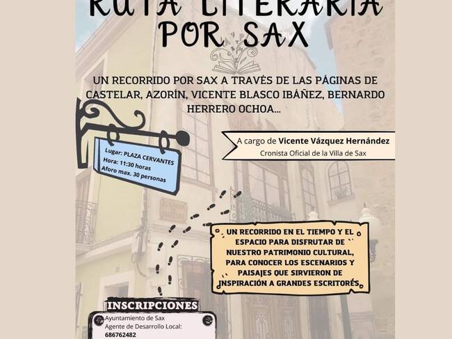 En Sax, la concejalía de cultura prepara, con motivo del día mundial del libro, y para el próximo 23 de abril una “ruta literaria”. El evento está siendo preparado por Vicente Vázquez, que es el Cronista Oficial de la Villa, y será un recorrido por las calles de la población a través de las páginas de Castelar, Azorín, Vicente Blasco Ibáñez ó Bernardo Herrero Ochoa, algunos de ellos escritores nacidos en Sax